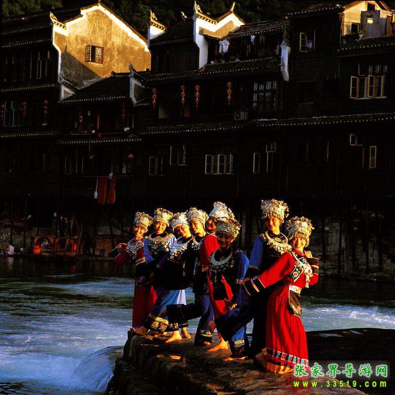 苗族是鳳凰古城最古老的民族。遠(yuǎn)古苗族生活在黃河流域,其先祖蚩尤曾與炎黃部落作戰(zhàn),失敗后苗裔退居江漢、洞庭湖一帶,建立三苗國(guó)。商周時(shí),三苗被破,苗祖遷徙到湘西“五溪”一帶,即今湘西、黔東等地,又由湘西分遷到西南各地。在中國(guó)古代典籍中,早就有關(guān)于五千多年前苗族先民的記載,這就是從黃河流域直到長(zhǎng)江中游以南被稱(chēng)為“南蠻”的氏族和部落。湘西苗族以遠(yuǎn)古驤蔸部落的仡熊仡夷為主體,融合三苗、盤(pán)瓠兩個(gè)部落中的一部分先民組成。苗族有自己的語(yǔ)言,苗語(yǔ)分三大方言:湘西、黔東和川黔滇。苗族地區(qū)以農(nóng)業(yè)為主,以狩獵為輔。苗族的挑花、刺繡、織錦、蠟染、剪紙、手飾制作等工藝美術(shù)瑰麗多彩,馳名中外。其中,苗族的蠟染工藝已有千年歷史。苗族服飾多達(dá)一百三十多種,可以同世界上任何一個(gè)民族的服飾相媲美。苗族是個(gè)能歌善舞的民族,尤以情歌、酒歌享有盛名。