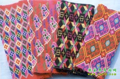 ![]() 織錦。又名“西蘭卡普”、“土花鋪蓋”,為土家族傳統(tǒng)工藝品之一,是森林公園工藝品廠的主要產(chǎn)品。織錦是在特制的本質(zhì)織機上以錦紗為經(jīng)、五彩絲線為緯、手工提花織成。以其質(zhì)地厚實、堅韌,色彩鮮艷,格調(diào)古樸,流暢生動著稱。圖案有花草、鳥獸、生產(chǎn)、生活、幾何、字樣等種類。為舊時土家姑娘必備嫁妝之一。據(jù)考證,早在漢代,土家織錦就作為方物貢入漢室宮廷。20世紀后,土家織錦曾漂洋過海至日、美、英等國展出,并作為禮品,被國家領導人贈送給外國元首及政府官員,如今織錦以壁掛、枕巾、沙發(fā)墊、桌圍、提袋、服飾等多種式樣遠銷世界各地。