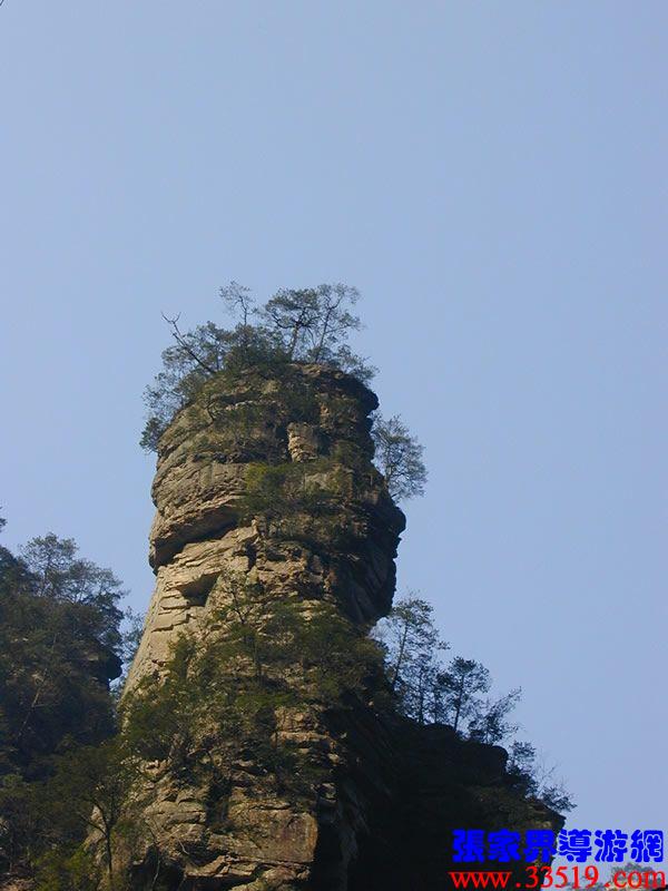 (花果山、水簾洞)孫悟空的花果山水簾洞到了。并不是張家界人過于牽強,胡亂把西游記的事兒往這兒湊,實在是巧合,《西游記》劇組的導游楊潔及唐僧、豬八戒、孫猴子、沙和尚等飾演者,一見到這地方就十分肯定地說:外景地選遍全國,只有張家界才真正是《西游記》筆下的神仙妖魔世界。大家順著我的指向往前看,左前方是帶著僧帽,披著袈裟,嘴中念念有詞的唐僧,緊跟在他后面的那座黑乎乎的石峰當然就是沙和尚了;神通廣大的孫猴子半蹲在唐僧后側(cè)手搭涼篷,正在觀察敵情呢;豬八戒哪去了?不用說,不是貪吃貪睡,就是偷偷找小女子搭訕去了,花心去了。