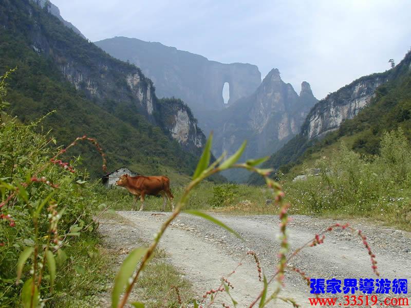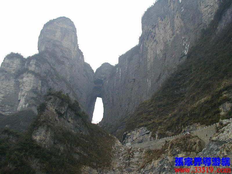(俯視天門(mén))站在這里可以俯視面向北面的天門(mén)洞,以及天門(mén)山公司正在修建的通天大道。1999年11月世飛賽期間,中央電視臺(tái)6號(hào)機(jī)組正是在這里拍攝飛機(jī)穿越天門(mén)驚人場(chǎng)面的。這兒距天門(mén)洞垂直高度200多米。