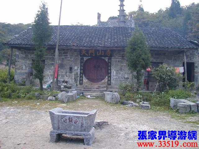 (天門(mén)山寺)天門(mén)山寺最早建于唐代,古稱云缽庵、靈泉院、嵩梁堂,明代時(shí),因擇址不當(dāng)而屢遭風(fēng)摧又常遭水荒,才將天門(mén)山寺從東部山頂遷移至此。以前這里古木參天,濃蔭蔽日。古寺門(mén)楣上刻有“天門(mén)仙山”四字,大門(mén)兩邊的對(duì)聯(lián)是:“天外有天天不夜,山上無(wú)山山獨(dú)尊”,傳為李自成部將野拂撰書(shū)。進(jìn)門(mén)為大佛殿后面有觀音堂,兩邊六間平房,最后一棟是祖師殿,規(guī)模宏大。民間概括為“三進(jìn)堂、六耳房,磚墻鐵瓦鍋如壙”。山寺原建筑十分講究,飛檐翹角,雕龍畫(huà)鳳,并塑有佛道神像菩薩等。還有大鼓一面,千斤大鐘一口,一座七級(jí)石塔和一個(gè)大化錢(qián)爐。據(jù)碑刻記載,自清乾隆至民國(guó)五年的163年間,天門(mén)山寺共修葺過(guò)七次,香火曾盛極一時(shí),湘鄂川黔邊境十多個(gè)縣的信徒絡(luò)繹不絕,都來(lái)這里進(jìn)香拜佛?,F(xiàn)天門(mén)山旅游股份有限公司正在大規(guī)模地修復(fù)天門(mén)山寺,昔日的繁華又將重現(xiàn)。