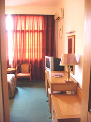 酒店簡介:賓館擁有豪華標準間間,普通標間、彩電、空調(diào)、高檔地毯、電話、整體淋浴房等,二十四小時供應(yīng)熱水,餐廳、宴會廳能容納180人同時就餐,卡拉宋、美容美發(fā)、桑拿按摩、旅游車隊、商務(wù)部、票務(wù)中心等配套服務(wù)設(shè)施一應(yīng)俱全,是住宿、餐飲、旅游度假、休閑娛樂的理想場所。 地 址: