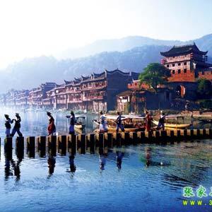 14:00左右 BUS赴鳳凰(省道+高速,4個小時),抵達鳳凰后客人自行游鳳凰夜景、漫步美麗的沱江邊。兩岸燈火闌珊,古城清幽而絢麗讓人留念往返。