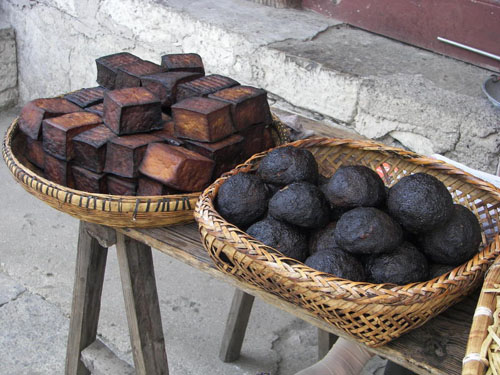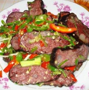 名稱: 血豆腐 介紹: 血豆腐,就是將豆腐和豬血、豬肉及花椒、辣椒等佐料拌成泥狀,捋成卵形,以竹篩置火炕上,煙熏烤成臘黃,吃起來耐嚼味香,是土家特色菜,當(dāng)?shù)厝顺R云湎戮啤?在張家界的飯館里很難吃到正宗的土家特色菜,可以去做土味的特色餐館去解解饞。但是最正宗還是鄉(xiāng)下人家家里自己熏的,那才叫一個好吃?。?!