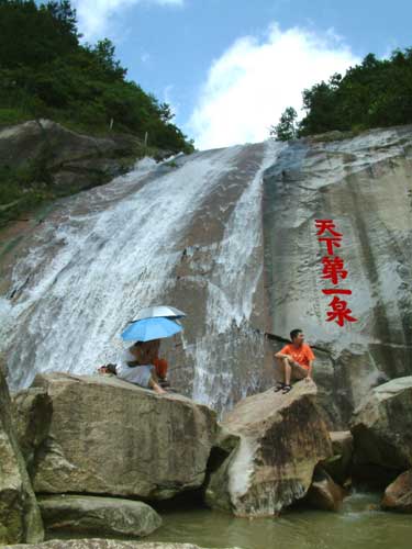 水簾洞瀑布源頭,在紫蓋峰的泉水。三支泉水匯集一起,流入水簾洞上方谷地。谷地闊三丈,原是梁朝的九位真人白日飛升的棲息之地,后建造九仙觀。九仙觀附近有太陽泉、洗心泉、洞真源、仙人池等。相傳泉水深不可測(cè)。泉水從石壁上飛流直瀉,發(fā)出雷鳴般的聲音,聲傳十里。明朝張居正游此地后說:“瀑泉灑落,水簾數(shù)疊,掛于云際,垂如貫珠,霏如削玉”。確實(shí),它從絕壁上噴瀉下來,寬達(dá)三太,高五十余米,瀉珠濺玉,仿佛一幅巨大的白布簾,在石壁當(dāng)中被亂石嶙巖擋住,然后再從石縫里屈曲折射,跳躍出來,滿谷水花四濺,閃爍著晶瑩奪目的光彩。水簾絕壁下的碧潭,天上的云彩和兩邊的蒼翠的山巒,構(gòu)成一幅美麗的山水畫。明朝張居正作《水簾洞》一贊道:“誤疑瀛海翻瓊浪,莫擬銀河倒碧流;自是湘妃深隱處,水晶簾掛五去頭”。這首詩可說是寫出了水簾洞的光、聲、影三絕的奇景了。