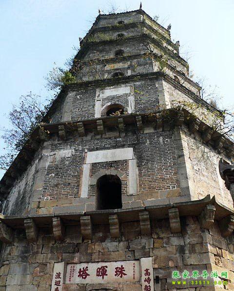 塔高10丈5尺,磚石結(jié)構(gòu),七層八棱,石階旋梯。正門(mén)西南向,上方漢白玉橫額鐫刻著斗大楷書(shū)“珠暉塔”三字,兩邊漢白玉雕刻楷書(shū)對(duì)聯(lián):“高峙船山遠(yuǎn)綿學(xué)脈,流回耒水廣助文瀾”。塔基四周刻有飛禽走獸圖形,塔內(nèi)拱門(mén)嵌有石刻碑文,為江蘇學(xué)政王先謙撰寫(xiě)、寧夏知府黃自文手書(shū),原為6塊,現(xiàn)存4塊。塔前建有廊廡,僧房數(shù)楹。塔尖銅頂,映日生輝。