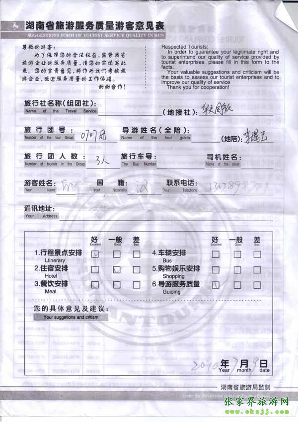 2010年7月9日昆明邱先生一行3位旅游質(zhì)量反饋
