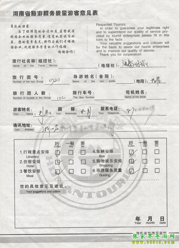 2009年7月22日浙江周先生一行10人接待質(zhì)量反饋單: