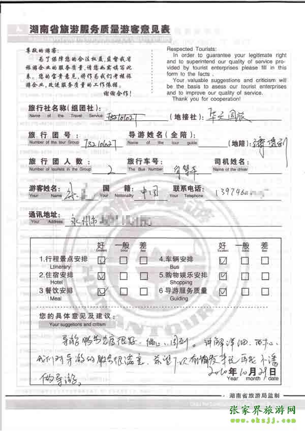 2010年10月29號永州朱先生一行兩位旅游質量反饋:對導游很滿意,下次來還找她