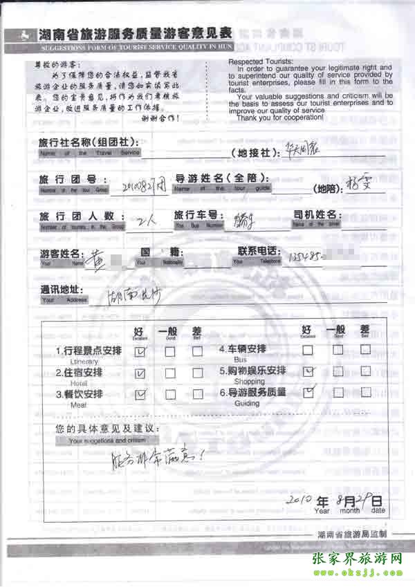 2010年8月29日長沙黃先生一行2位旅游質(zhì)量反饋:服務(wù)非常滿意