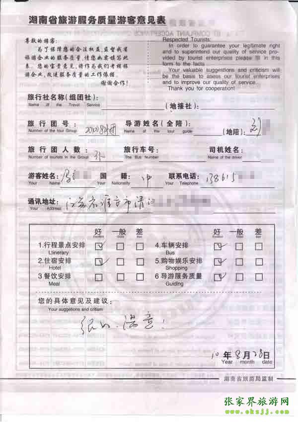 2010年8月28日江蘇馬先生一行3位 旅游質量反饋:很好,滿意