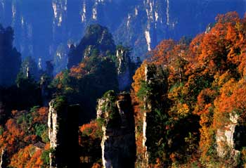 森林覆蓋率達(dá)97.7%的張家界,無(wú)愧于中國(guó)第一個(gè)國(guó)家森林公園的稱(chēng)號(hào)。其植物種類(lèi)比整個(gè)歐洲擁有的樹(shù)木種類(lèi)多一倍以上。珍貴樹(shù)種包括屬?lài)?guó)家一級(jí)保護(hù)的珙桐(外國(guó)人又叫“中國(guó)的鴿子花”)和屬?lài)?guó)家二級(jí)、三級(jí)保護(hù)的鐘萼木、銀杏、香果樹(shù)以及鵝掌楸、香葉楠、杜仲、金錢(qián)柳、貓兒屎(第三紀(jì)殘遺樹(shù)種)、銀鵲、南方紅豆杉等,是個(gè)實(shí)實(shí)在在的森林寶庫(kù)。 冬天走在這樣的森林寶庫(kù)里,滿(mǎn)眼的綠帶給你的卻是春天般的溫暖。精靈奇巧的霧凇千姿百態(tài),笨拙憨厚的灌木清純天成……踏著片片落葉,遙望遠(yuǎn)峰勁綠,深呼吸一口初冬微涼的空氣,春、秋、冬三季在這一刻蒙太奇般地拼在了一起,夢(mèng)幻般的感覺(jué)縈繞不去。 好山好水不冬眠