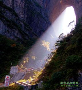 中國最高的自然“天門洞” 公元263年即三國吳永安永安六年時,吳王孫休見其高峻雄偉,巍峨壯觀,便將武陵郡分置天門郡,從此天門冊名傳遐邇,譽貫古今。天門洞周圍簇涌著丹灶,老僧、玉壺、玉堂、金匱、筆架、將軍、箭桿、漆圓、弩牙、猿點、天姥、負(fù)兒、簸箕、雞籠、高遠(yuǎn)等16座山峰,其間又鑲嵌著雷、電、風(fēng)、云、泥、蛇、龜、祖師、玉皇、鬼谷、果老、玄天、合山、求兒、鐘鼓、老龍等16洞府,幽默盤亙,使得天門山在雄偉之中又增添了神奇和秀麗。流水清洌的澧河為天門山頻映倒影,寬廣低平的田疇為其鋪就如茵綠毯,繁茂的森林裝點著山基和山頂,淡云薄霧為她峨冠霞佩,朝暉夕照為她斜染紅裝。隨著四季的更替,她春茵夏碧秋金冬縞,呈現(xiàn)出無窮的變幻。天門山生態(tài)系統(tǒng)給天門洞的神奇增添了新的魅力。 據(jù)說,天門洞開景區(qū)的有上天梯。有著九百九十九級臺階的上天梯!