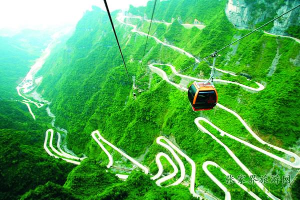 考慮到索道運行時間較長,高溫時游客們需要通風(fēng),每個轎廂專門設(shè)計了兩個通風(fēng)窗,以形成空氣的對流,這人性化設(shè)計在國內(nèi)是唯一的。索道鋼繩則來自于法國,直徑50.1mm,每米重達(dá)10kg,確保游客安全無虞。 天門山索道最大的亮點就是它的爬坡面支架的設(shè)計 ,這個支架共有壓索輪96個,托索輪16個,它綜合了現(xiàn)代物理學(xué)、現(xiàn)代工程學(xué)、現(xiàn)代制造業(yè)中最先進(jìn)的理論和成果,應(yīng)用了世界最先進(jìn)的索道技術(shù),從而使這段索道總給人一種蕩氣回腸、氣勢沖天的感覺。 天門山索道以張家界市中心的城市花園為起點,直達(dá)天門山頂?shù)脑伎罩谢▓@,猶如一道彩虹飛渡“人間” “天上”,又象一條巨龍騰翔素云蒼穹,依山籍壁,拔地沖天,蕩氣回腸,恢宏壯觀,成為天門山旅游風(fēng)景區(qū)“四大奇觀”之一,為張家界這一世界級風(fēng)景名勝區(qū)又添絕世奇景。