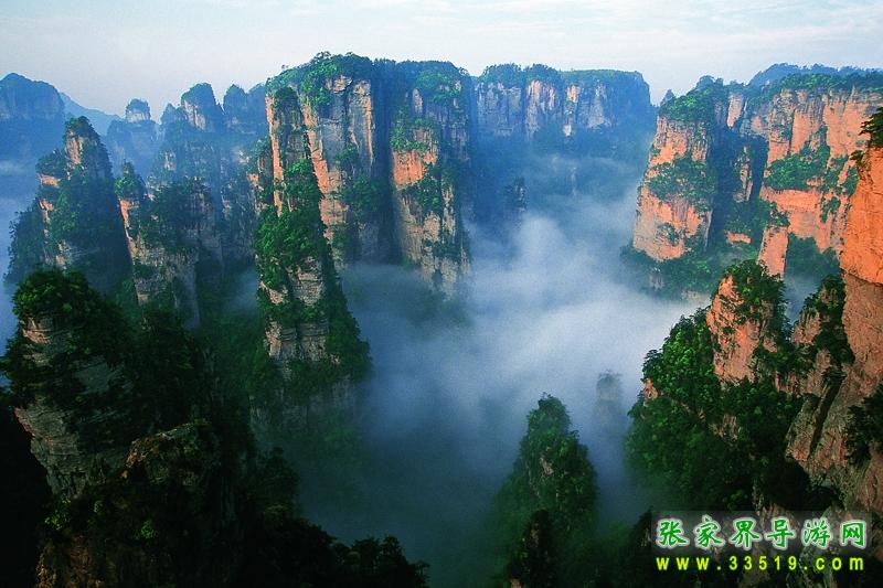 第二天早上,我們參觀了袁家界的風(fēng)景,其中最有名的當(dāng)然數(shù)天下第一橋,這是由兩座巖石山的山頂自然生長(zhǎng)在一起,非人所能為也。天下第一橋的稱號(hào)當(dāng)之無(wú)愧啊。當(dāng)然在袁家界,后花園也是不能不看的。張家界號(hào)稱“峰三千,水八百”,在這里你就能明顯的感覺(jué)到這句話的前半句是那么的實(shí)在??赐陱埣医绲暮诵脑医?,我們乘車到了天子山(張家界景區(qū)內(nèi)的最高的地方)。玩了賀龍公園、御筆峰、仙女散花、西海、石船出海、仙人橋、天子廟、十里畫廊、一步難行。不巧的是,那天山上下了一點(diǎn)陣雨,雨后一條彩虹掛在天上,更重要的是山上起了一點(diǎn)霧,使整座山都籠罩在霧中,若隱若現(xiàn),看上去就象是在云海中,好象老天特地配合我們似的,難得一見(jiàn)的西海等正好被我們趕上了。江導(dǎo)告訴我們,這樣的機(jī)會(huì)是很難得的,可能是張家界為了感謝我的再次到來(lái),給了我一個(gè)特別的禮物吧。我大笑。晚上趕到昨天住的地方去住宿。不提。